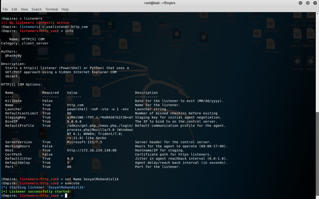 Empire açtıktan sonra resimde görüldüğü gibi eğer listener yoksa uselistener komutu ile bir adet listener oluşturuyoruz.