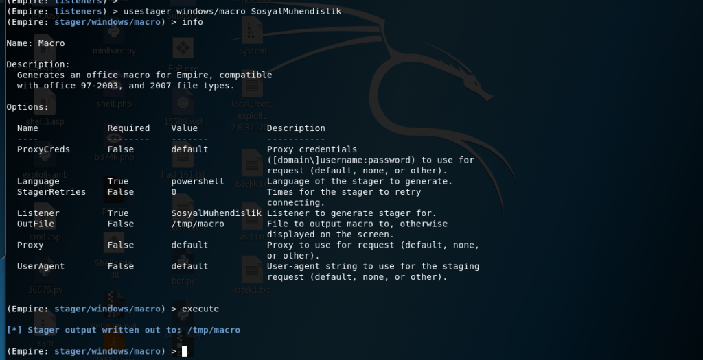usestager windows/macro Listener_Adı komutu ile stager kullanıp macro olarak powershell payloadı oluşturabilmekteyiz.
