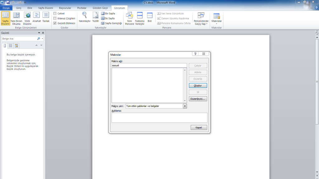 Bu kısımda denemek için ben word dosyası açıp, Görünüm ->Makrolar a tıklayarak bir makro oluşturdum.