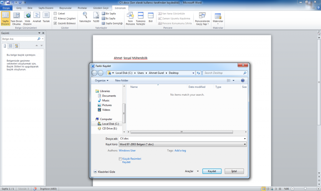 Yaptığımız işlemleri kaydettikden sonra, farklı kaydet diyerek Word 97-2003 dosyası olarak kayıt ediyoruz. Artık dosyamız hazır hedefe göndereceğimiz son şeklinde, bir senaryo ile hedefe gönderip açtırmak hayal gücünüze ve yeteneğinize kalıyor.