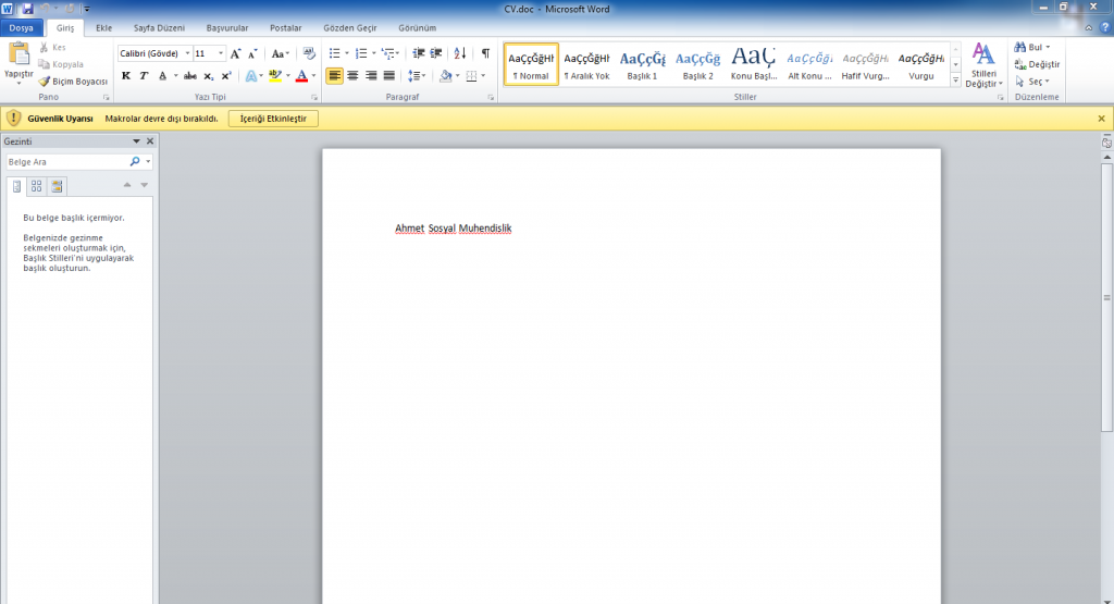 Dosyayı açtığımızda macroyu etkinleştirme uyarısı gelmekte, eğer hedefiniz dosyaya güvenip İçeriği Etkinleştir’e tıklarsa her şey başarılı bir şekilde gerçekleşecektir.