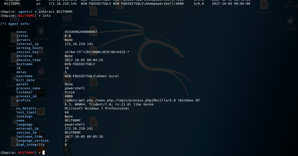 Sistem bilgileri bu şekilde karşımızda, bundan sonra Empire Post Exploitation aşamaları kolaylıkla gerçekleşmektedir, bir önceki yazıda bulunmakta bu aşamalar.