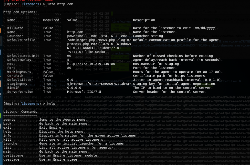 Listener başlatmak için : uselistener http_com diyerek seçilir. info http_com ile parametreler görülmektedir. set ve unset komutları ile parametreleri düzenledikten sonra execute komutu ile listener başlatılır. Daha sonra listeners komutu ile listenerlar listenebilir.