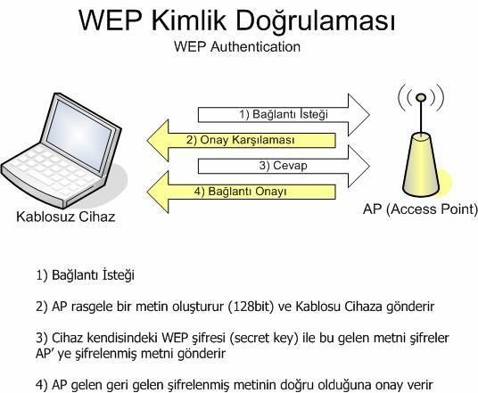 WEP ağına bağlanılırken aşağıdaki gibi kimlik doğrulama gerçekleşir.