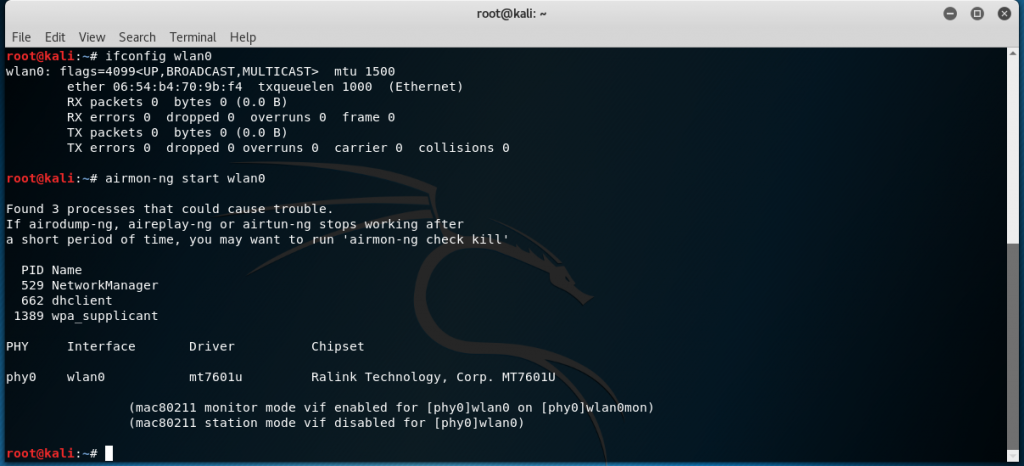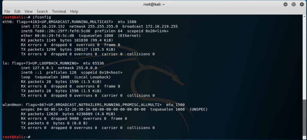 Yukarıdaki resimde gördüğümüz gibi wlan0 monitor moda geçerek wlan0mon olmuştur.