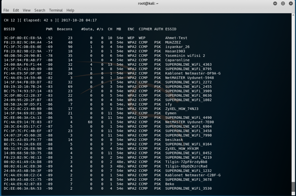 airodump-ng wlan0mon komutu ile etraftaki paketleri dinleyerek kablosuz ağlar hakkında bilgi topluyoruz. Yukarıda ki resimde gördüğümüz gibi BSSID, ESSID ve Channel bilgileri görüntülenmektedir.