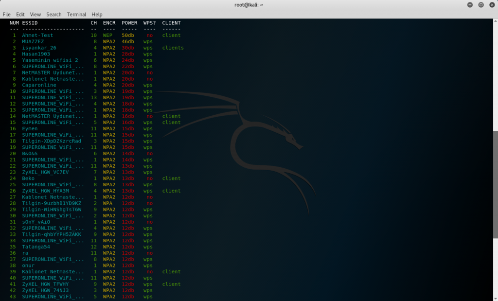 Terminalimize wifite yazarak aracımızı başka bir aracımızı açıyoruz. WPS ve Clients bilgilerini görebilmekteyiz.