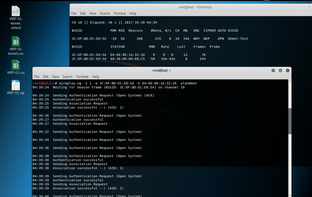 aireplay-ng -1 1 -a 3C:DF:BD:EC:E8:5A -h D4:6E:0E:1A:32:26 wlan0mon komutu ile fake authentication oluşturarak daha hızlı bir şekilde paket toplama işlemi gerçekleştireceğiz. -1 ile fake authentication üreteceğimizi aireplay-ng aracına belirttikden sonra kaç saniyede bir gönderileceğini girdik. -a parametresi ile BSSID (Hedef Mac adresini) giriyoruz. -h ile kendi adaptörümüzün mac adresini giriyoruz ve fake authentication paketleri gönderiyoruz.