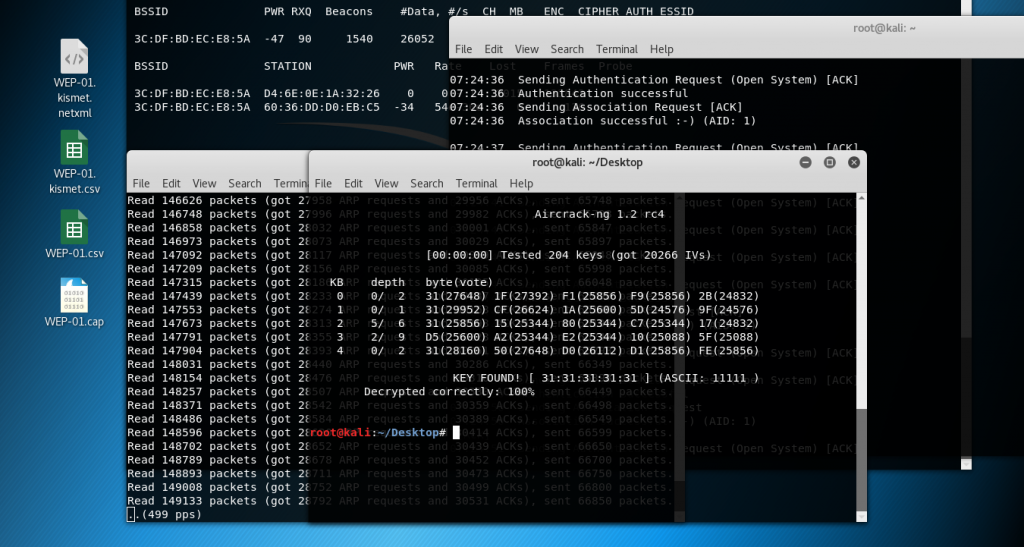 aircrack-ng WEP-01.cap komutu ile yeterli sayıda IV (Initialization Vector) paketi toplandığında WEP parolası kırılmaktadır.