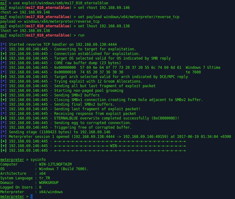 Metasploit’e bu açıklık çıktıktan hemen sonra eklenen ms17_010_eternalblue exploit’i birinci yöntemde exploit etmektedir.Fakat bu exploit sadece Windows 7 ve Server 2008 R2 (x64) sistemlerde çalışmaktadır.