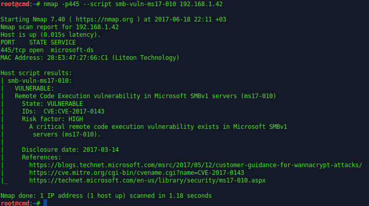 nmap -p445 --script smb-vuln-ms17-010 192.168.1.42