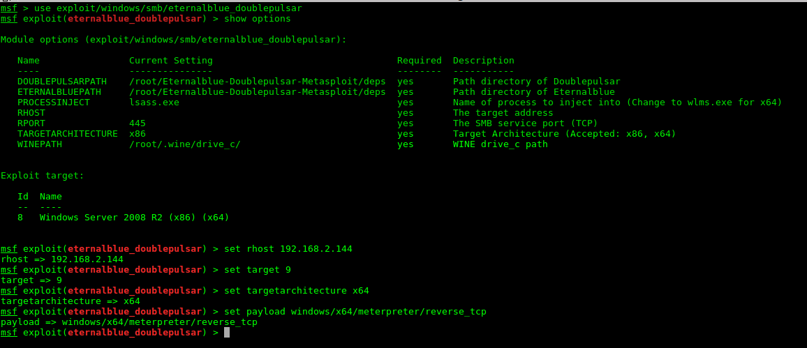 msf>use exploit/windows/smb/eternalblue_doublepulsar
