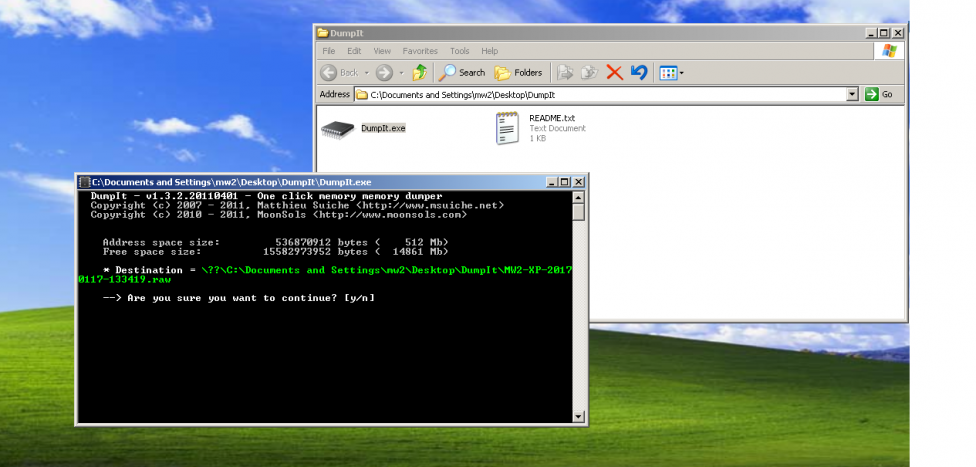 Dump It i tıkladığımızda önümüze bu terminal programı gelmekte ve bize devam etmek istediğimizden emin olup olmadığımızı soruyor buna y tuşuna basıyoruz ve ımajımız programın klasörünün içine alınmakta.