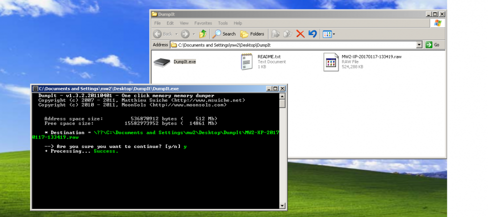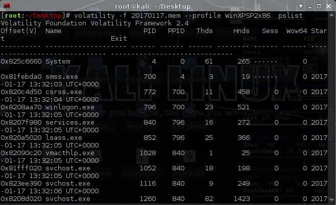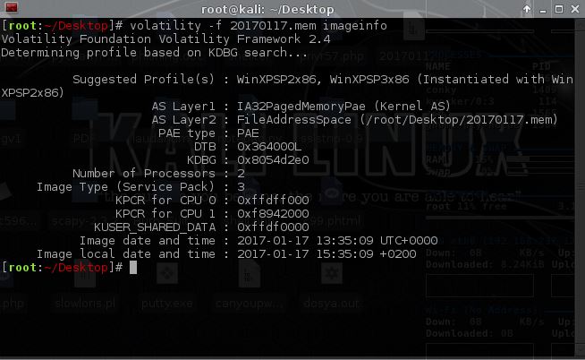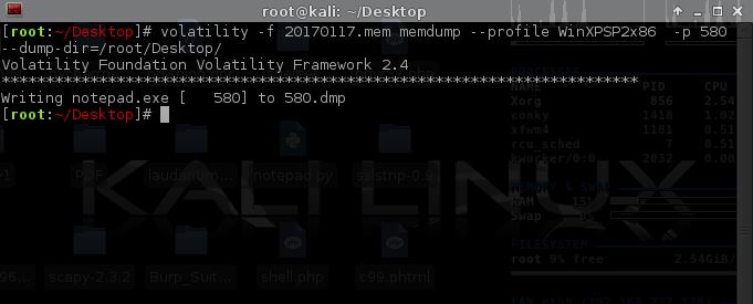 volatility -f 20170117.mem memdump --profile WinXPSP2x86 -p 580 --dump-dir=/root/Desktop/