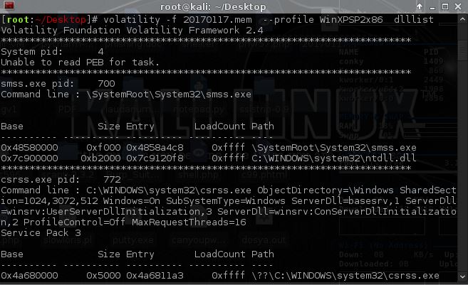 volatility -f 20170117.mem  --profile WinXPSP2x86  dlllist