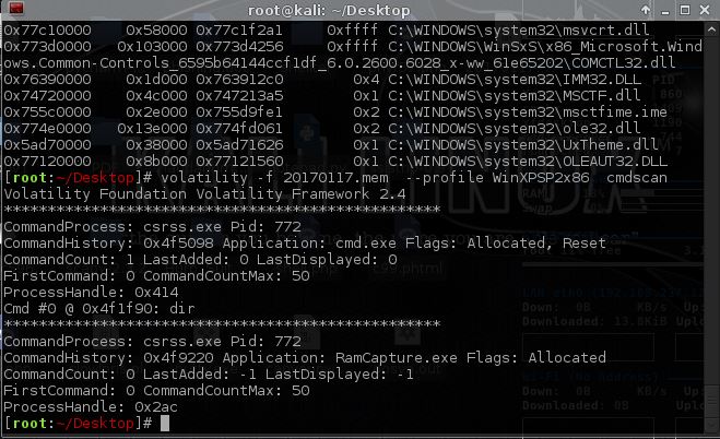 volatility -f 20170117.mem  --profile WinXPSP2x86  cmdscan