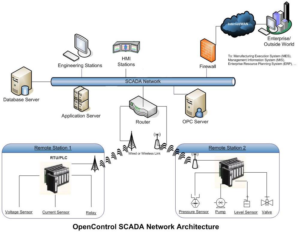 Yukarıda gördüğünüz örnek bir SCADA Network topolojisidir. Uzakdaki PLC istasyonlarından sensörlerden toplanan verileri toplayarak merkezi olarak denetlenmesini sağlamaktadır.