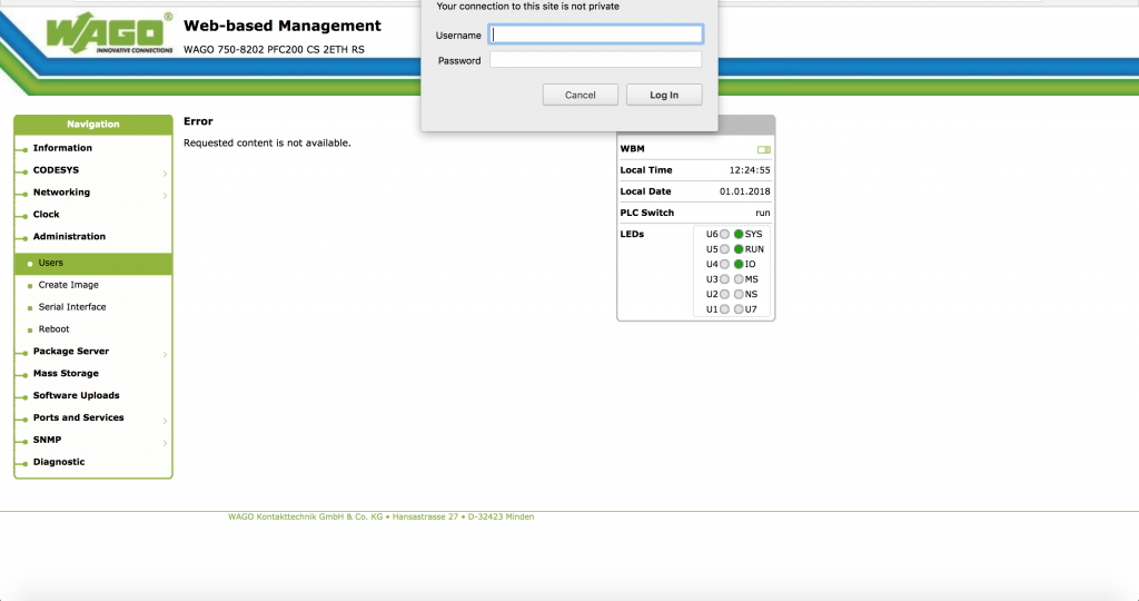 Yukarıda ki resimde bulunan WAGO yazılımı SCADA yazılımlarının web tabanlı yönetim panelidir. Bu web tabanlı yönetim panelleri internete açık bir şekilde bırakılmamalıdır. Dışarıdan erişilmesi gerekiyorsa IP kısıtlaması veya VPN kullanılmalıdır. WAGO üzerinden tüm servis, port ve sistem hakkındaki tüm bilgilere erişilip hatta sistemi yeniden başlatılabilir.