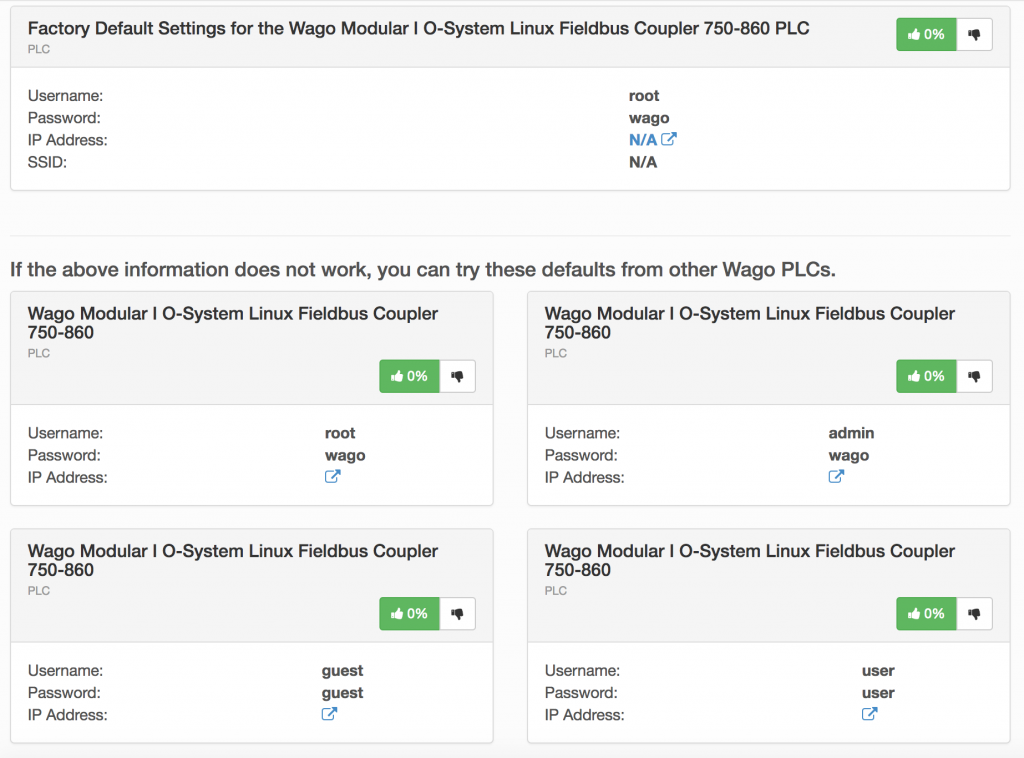 Yukarıda ki resimde WAGO web tabanlı yönetim panelinin varsayılan parolaları görülmektedir. Bunlar herkese açık bir şekilde bulunmaktadır. Hem dışa açık hemde ön tanımlı kullanıcı adı ve parola kullanımı oldukça kötü sonuçlara neden olabilir. SCADA yazılım ve sistemlerinin ön tanımlı kullanıcı adı ve parolalarına buradan ulaşabilirsiniz.