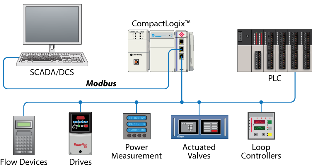 Yukarıda Modbus protokolunun SCADA içinde kullanım örneği görülmektedir. MODBUS protokolü seri port ve internet protokollerini kullanarak haberleşme yapar. ( MODBUS RTU, MODBUS ASCII,MODBUS PLUS, MODBUS TCP/IP )