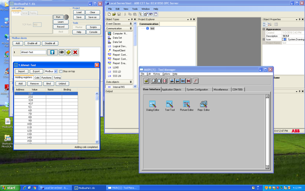 Yukarıda ki resimde ABB MicroSCADA Pro SYS600 9.3 ve Modbus TCP/IP protokolünü kullanan Modbus Pal 1.6b Client uygulamalası görülmektedir.
