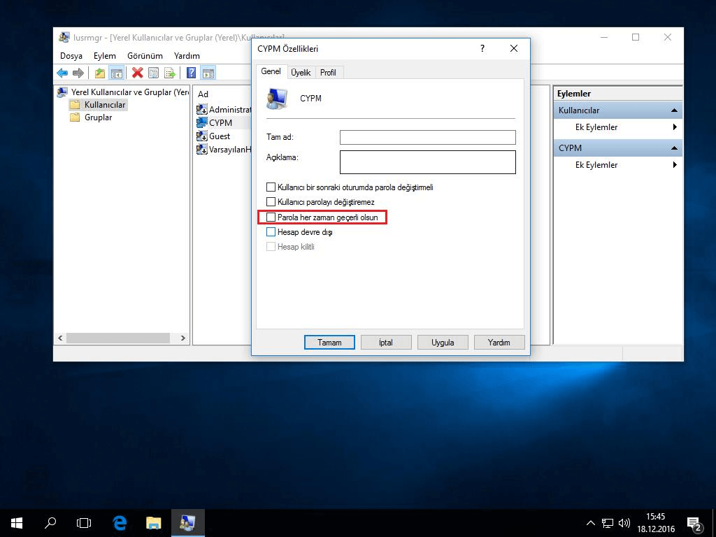 Parola her zaman geçerli olsun kutucuğundaki onayı kaldırıp ayarımızı kaydediyoruz. Artık kullanıcı hesabımız Windows’ta varsayılan olarak 42 gün ayarlı olduğu için 42 gün sonunda bizden parolamımızı değiştirmemizi isteyecek. Dilersek zaman aşımı gün ayarlamasını da yapabiliriz. Bunun için de: Çalıştır ‘a secpol.msc yazarak Yerel Güvenlik İlkesi ayarlarına erişiyoruz. Hesap İlkeleri-> Parola İlkesi-> Parola Geçerlilik Üst Sınırı yolunu izleyerek parolamızın geçerliliğini yitireceği günü belirliyoruz. Parola sürelerinin ortamınıza bağlı olarak 30-90 gün arasında dolmasının sağlanması en iyi güvenlik uygulamasıdır. Böylece, saldırganın kullanıcının parolasını ele geçirmek için sınırsız bir süresi olmayacaktır.