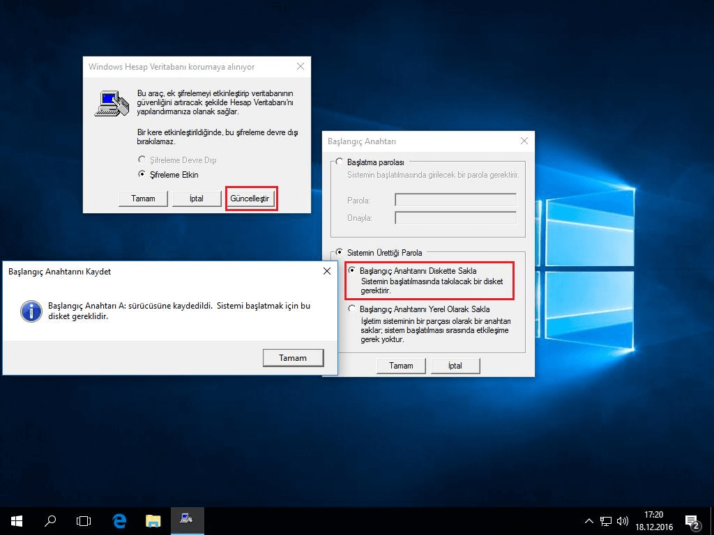 Güncelleştir’e tıklayıp Başlangıç Anahtarını Diskte Sakla seçeneğini seçip tamam diyoruz. Artık Windows başlangıcında bizden USB belleğimizi bağlamamızı isteyecek, aksi takdirde giriş yapmamız mümkün olmayacaktır.